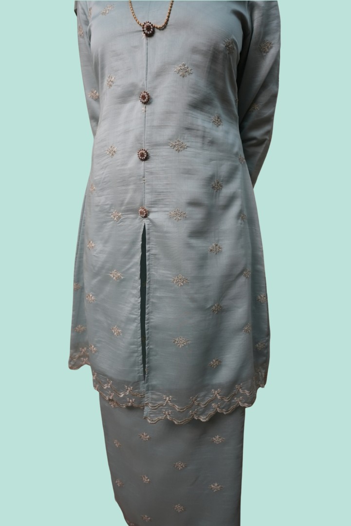 A graceful Kurung Riau in a rich Mint Green hue, beautifully adorned with delicate embroidery that reflects refined craftsmanship and timeless elegance. Crafted from comfortable organza silk material, this piece features elegant detailing along the hem and sleeves, blending classic heritage with modern sophistication for elevated modest wear.