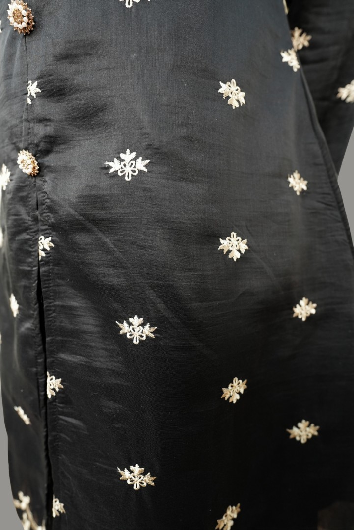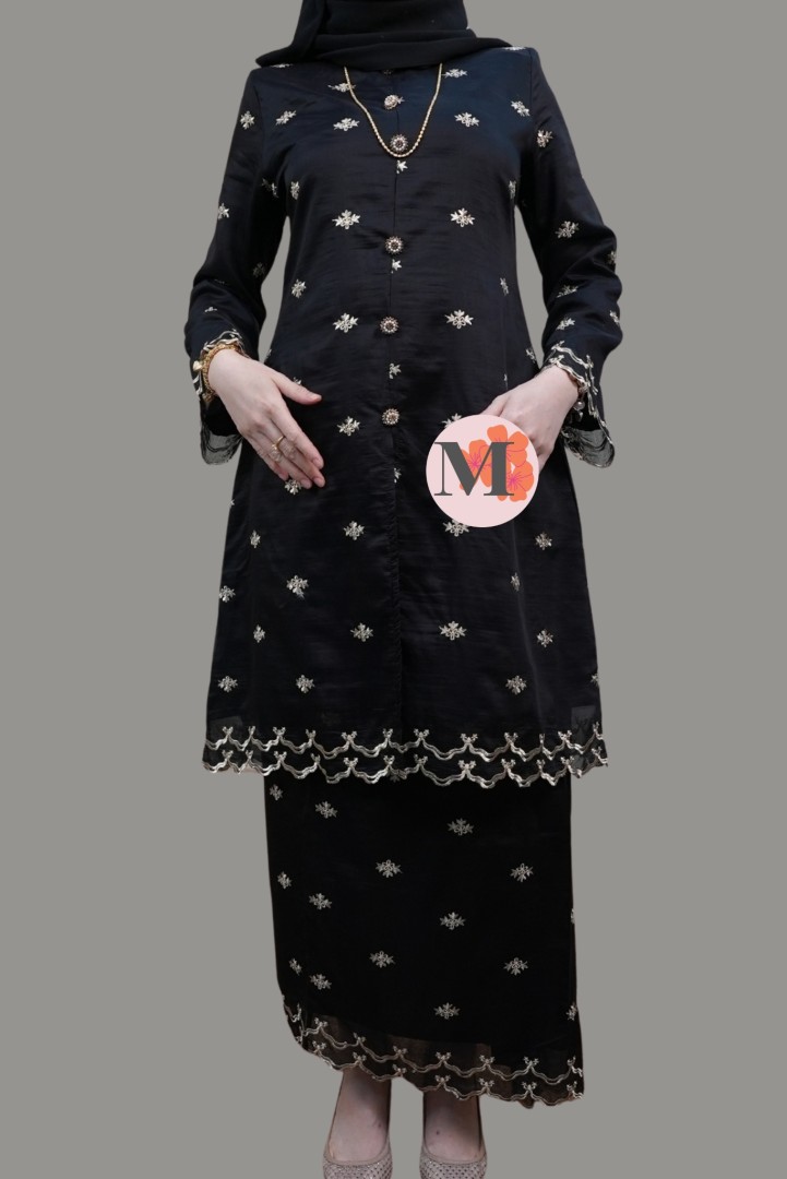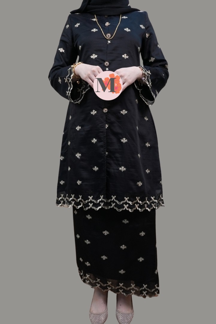 A graceful Kurung Pahang in a rich Black hue, beautifully adorned with delicate embroidery that reflects refined craftsmanship and timeless elegance. Crafted from comfortable organza silk material, this piece features elegant detailing along the hem and sleeves, blending classic heritage with modern sophistication for elevated modest wear.