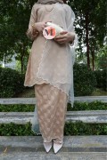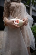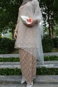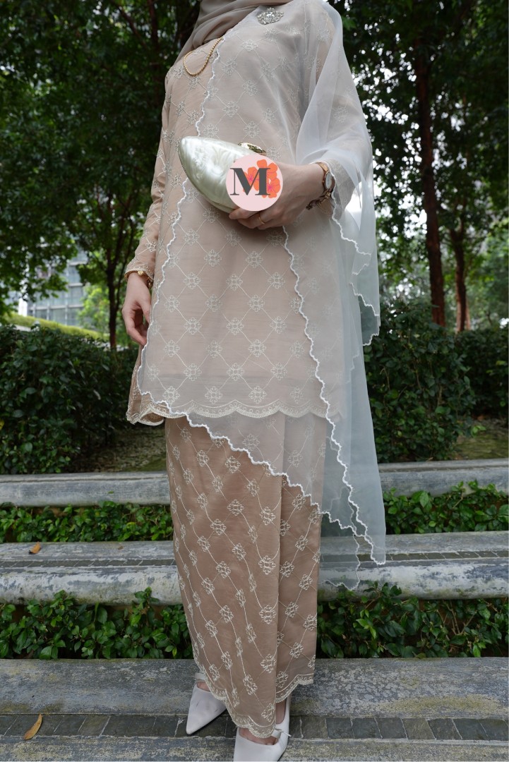 A graceful Kurung Riau crafted in a Champagne tone, featuring delicate all-over lace embroidery. Designed with a refined outer layer and scalloped hems, this elegant piece creates a feminine and timeless silhouette, perfect for classic traditional styling.