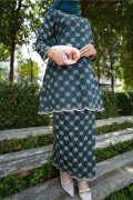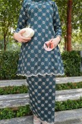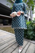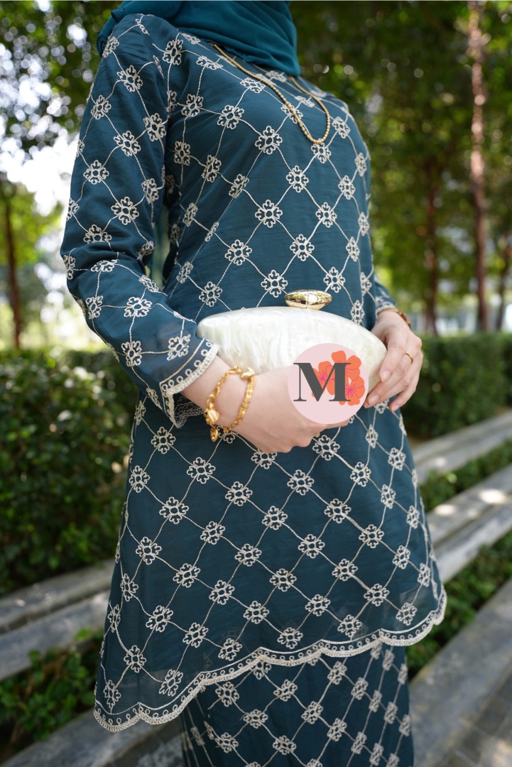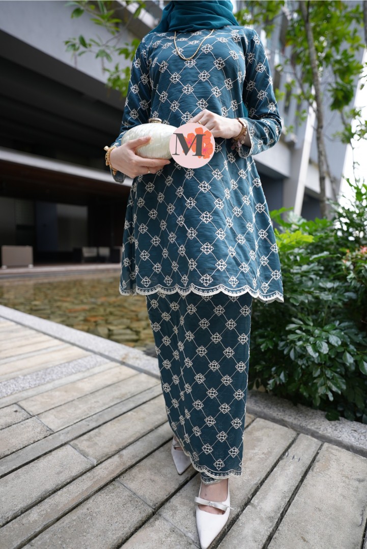 A graceful Kurung Riau crafted in a Teal Green tone, featuring delicate all-over lace embroidery. Designed with a refined outer layer and scalloped hems, this elegant piece creates a feminine and timeless silhouette, perfect for classic traditional styling.