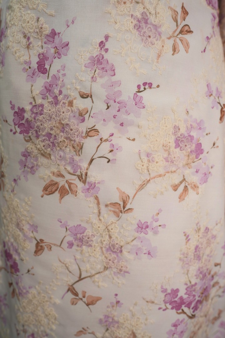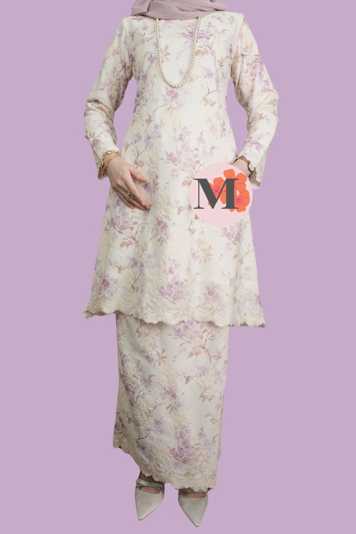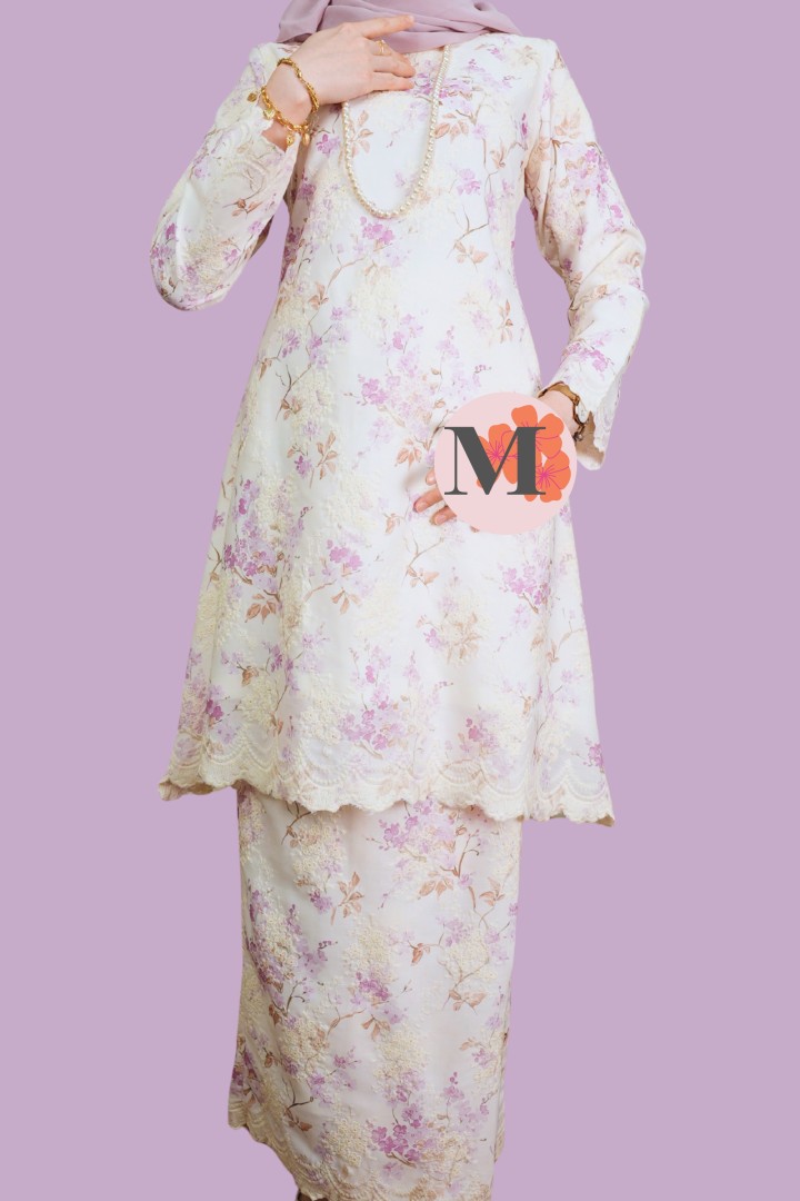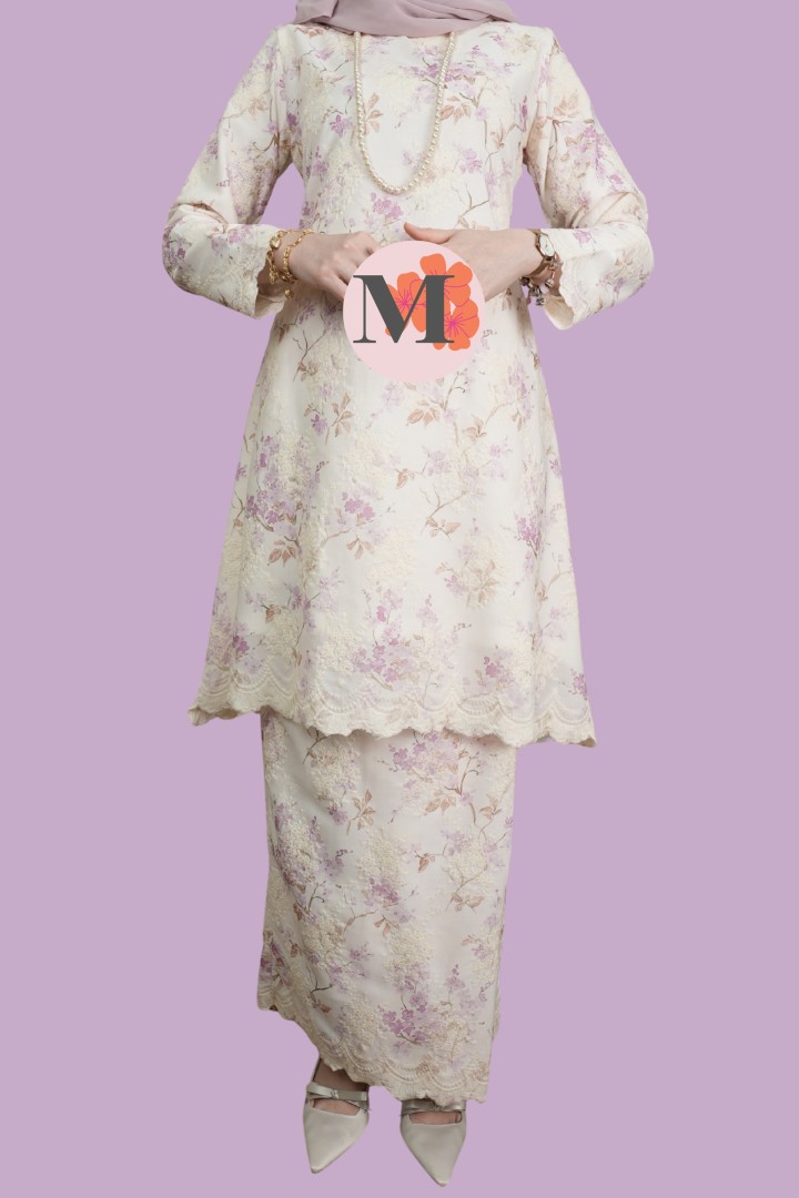 Corak bunganya tampak hidup dengan gabungan perincian sulaman benang krim, digandingkan warna-warna lembut seperti Purple Lavender, Soft Pink, Peach Salmon, Soft yellow dan Powder Blue. Hasilnya ialah busana yang memancar aura sopan, segar, dan klasik.